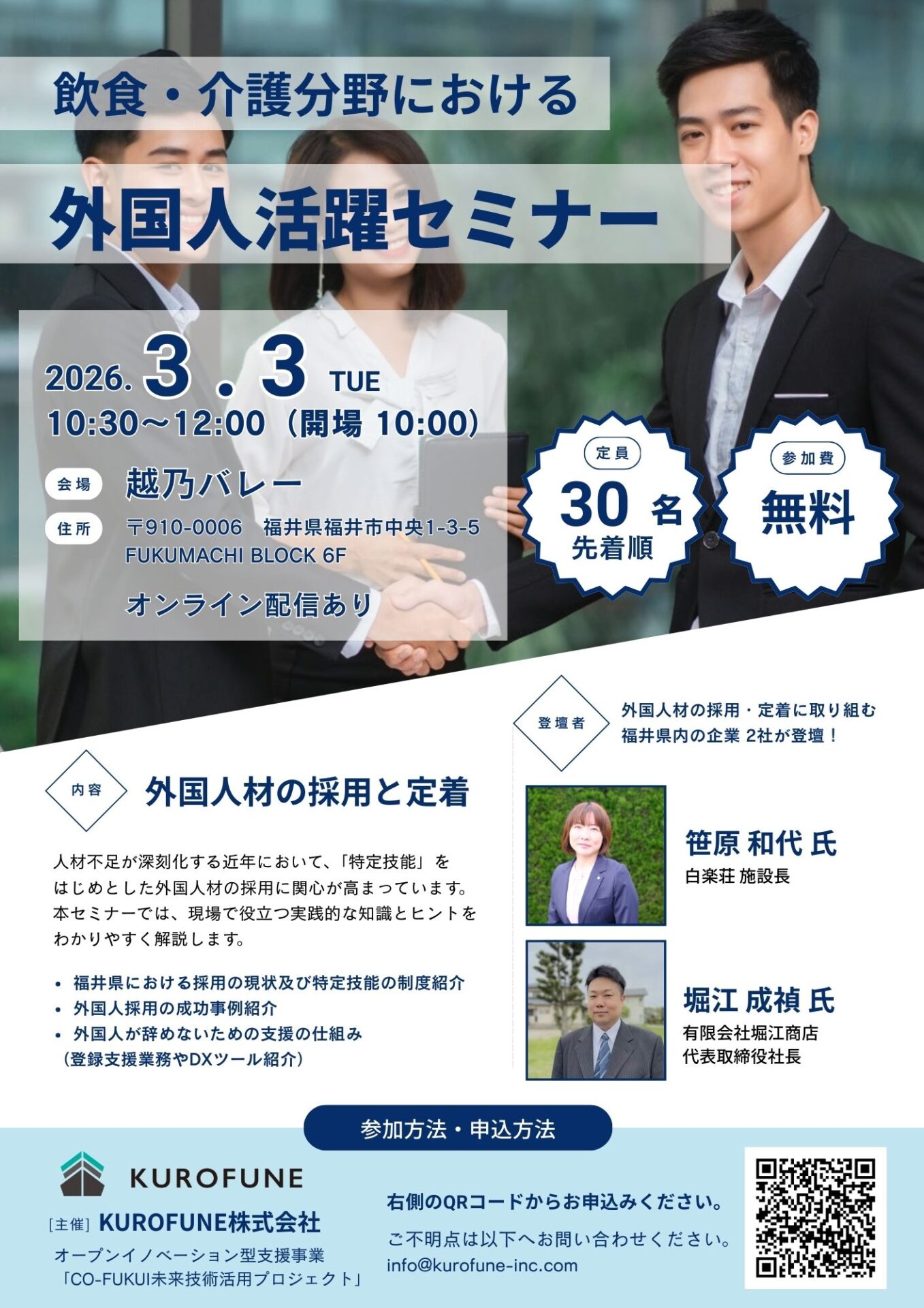 この度KUROFUNE株式会社は、福井市にて「飲食・介護分野における外国人活躍セミナー」を開催する運びとなりましたので、ご案内申し上げます。